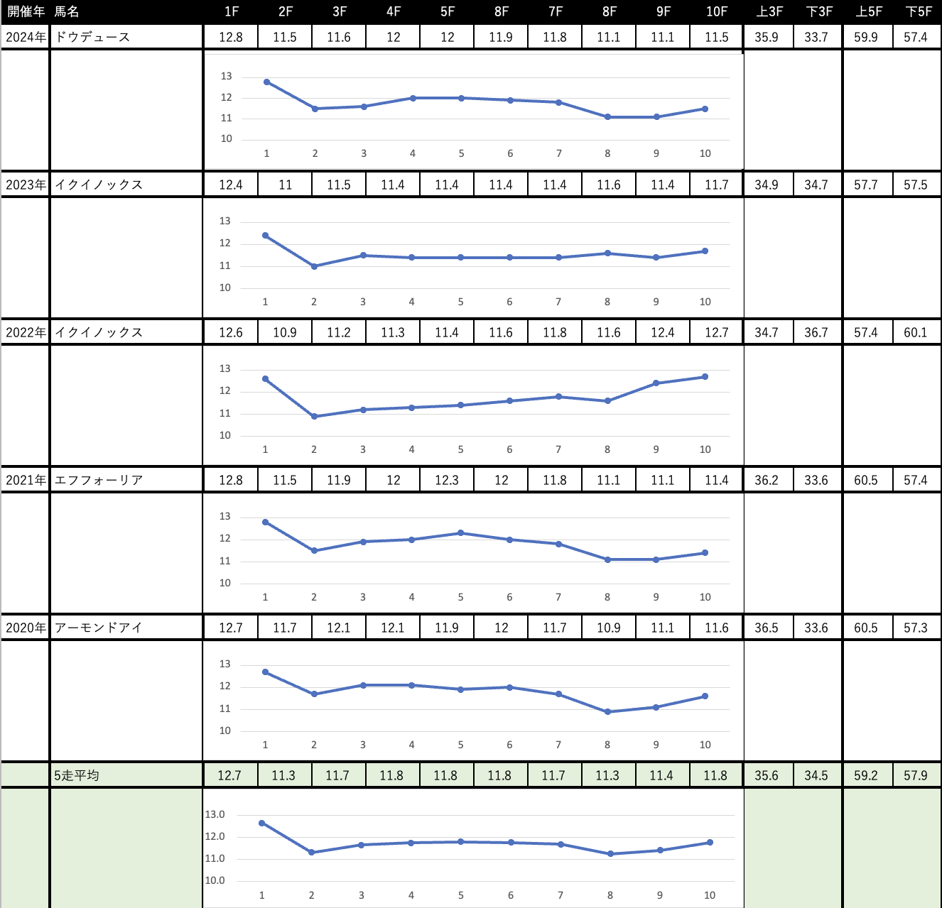コロナ渦前後の年は少頭数で引っ張る馬が不在の時が多く、前半スローでそこまで負荷のかからないラップ構成の年が続いていました。2022年と2023年はパンサラッサ、ジャックドールが強気の逃げで天皇賞秋らしいレースラップを刻んでくれましたが、昨年は行く馬が不在で超スローペース。