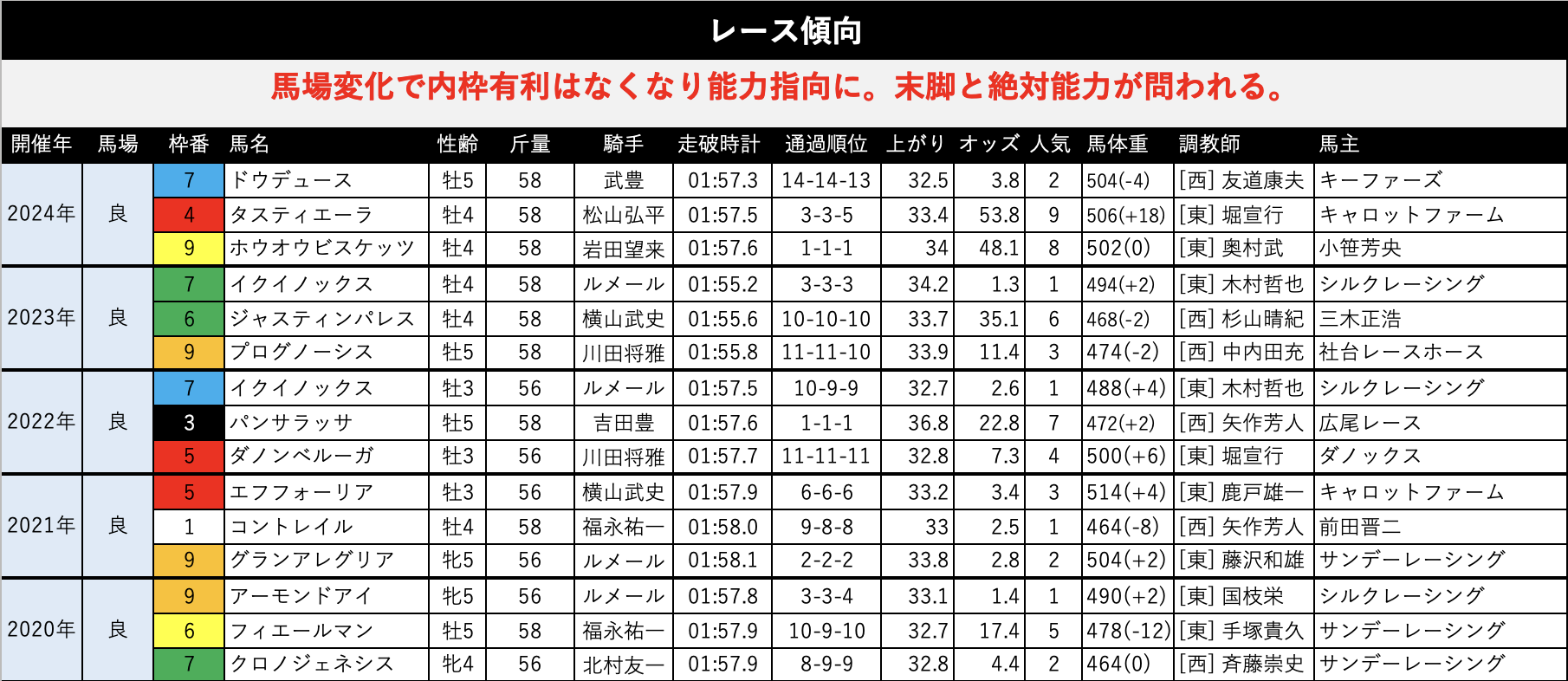 また、スタート直後にコーナーがある東京芝2000mなので8枠の成績が悪くはなっていますが、近年は東京芝の傾向が変わってきているために以前ほど内枠有利、外枠不利ではなくなってきている印象。いまだに内枠の馬から人気していくと思いますが、よほど外を回らされそうな枠並びとかでなければ外枠でも問題ないと思います。