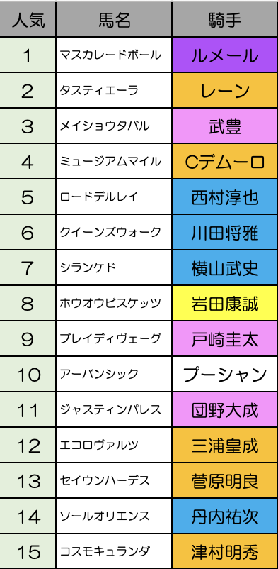 東京巧者で皐月賞と日本ダービーどちらも好走したマスカレードボールがルメール騎乗なら1番人気でしょう。2番人気は難しいですが、枠次第でタスティエーラ、メイショウタバル、ミュージアムマイルあたりが変わりそう。