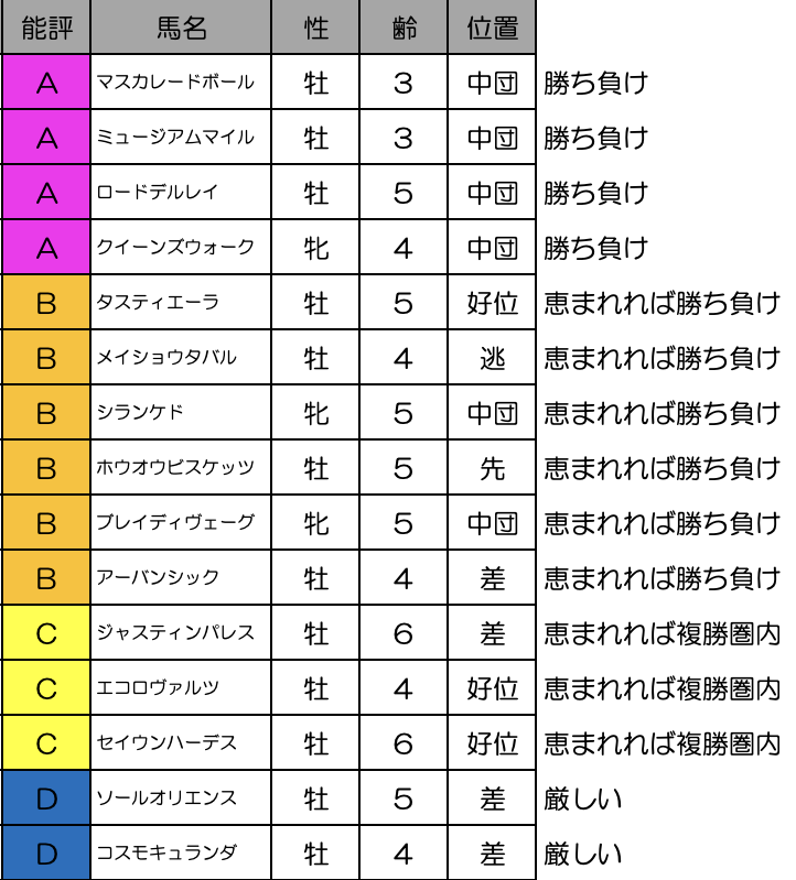 クイーンズウォークはここに挙げるか迷ったのですが、新潟記念除外での仕上がりの面と、やはり川田騎手が位置を取りすぎちゃわないかが少し心配。