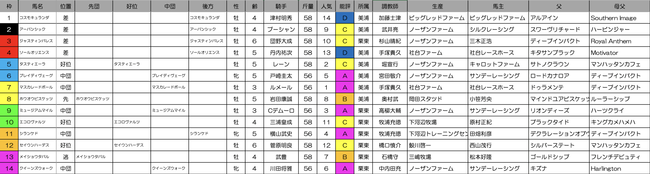 逃げ候補はメイショウタバルとホウオウビスケッツの2頭。おそらくメイショウタバルが逃げると見ていますが、メイショウが逃げるとなればそこまでペースを落とさずのミドルペースになるんじゃないでしょうか。しっかりと地力が問われた上で決め手が問われるレースになりそうです。