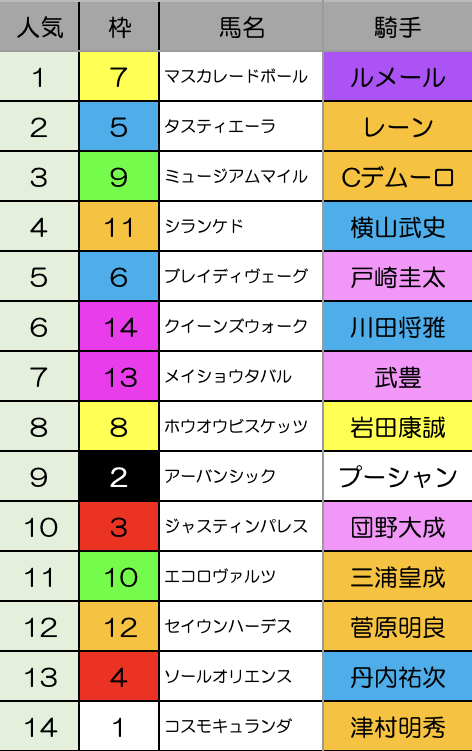1番人気はマスカレードボールで確定でしょう。2番人気は難しいですが、内目の枠が引けて前年2着でレーン騎手のタスティエーラあたり。