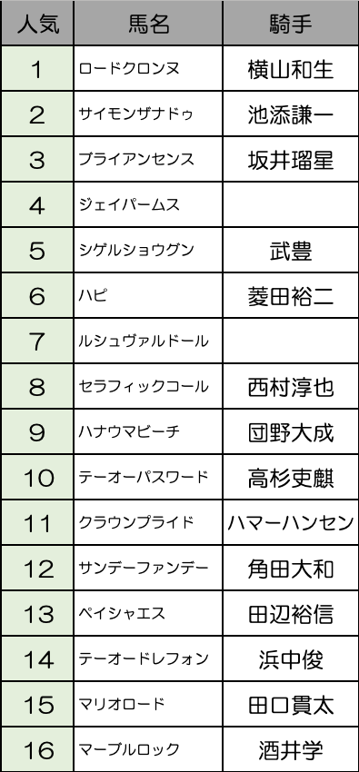 ロードクロンヌ、サイモンザナドゥ、ブライアンセンス、ジェイパームスの4頭が人気の中心になりそう。混戦のオッズになるんじゃないでしょうか。