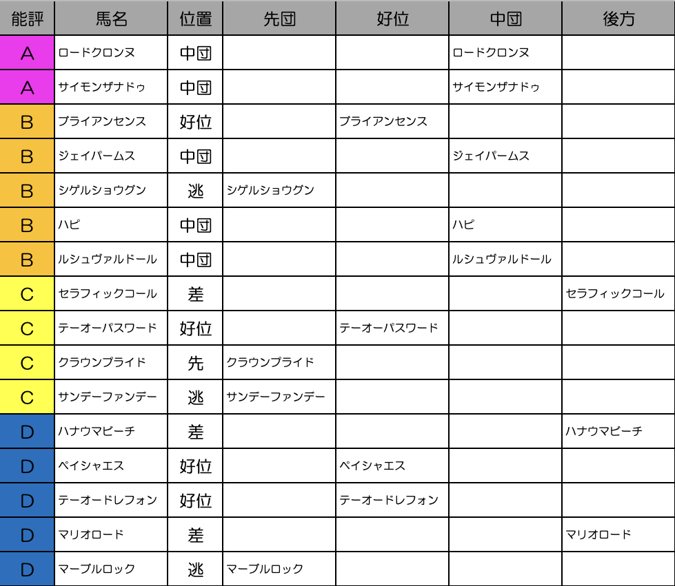 シゲルショウグン、サンデーファンデー、マーブルロックなど徹底先行タイプの馬が多いメンバー構成。ペースは速くなりそうで、タフな馬場でオーバーペースで差し馬有利になるんじゃないでしょうか。