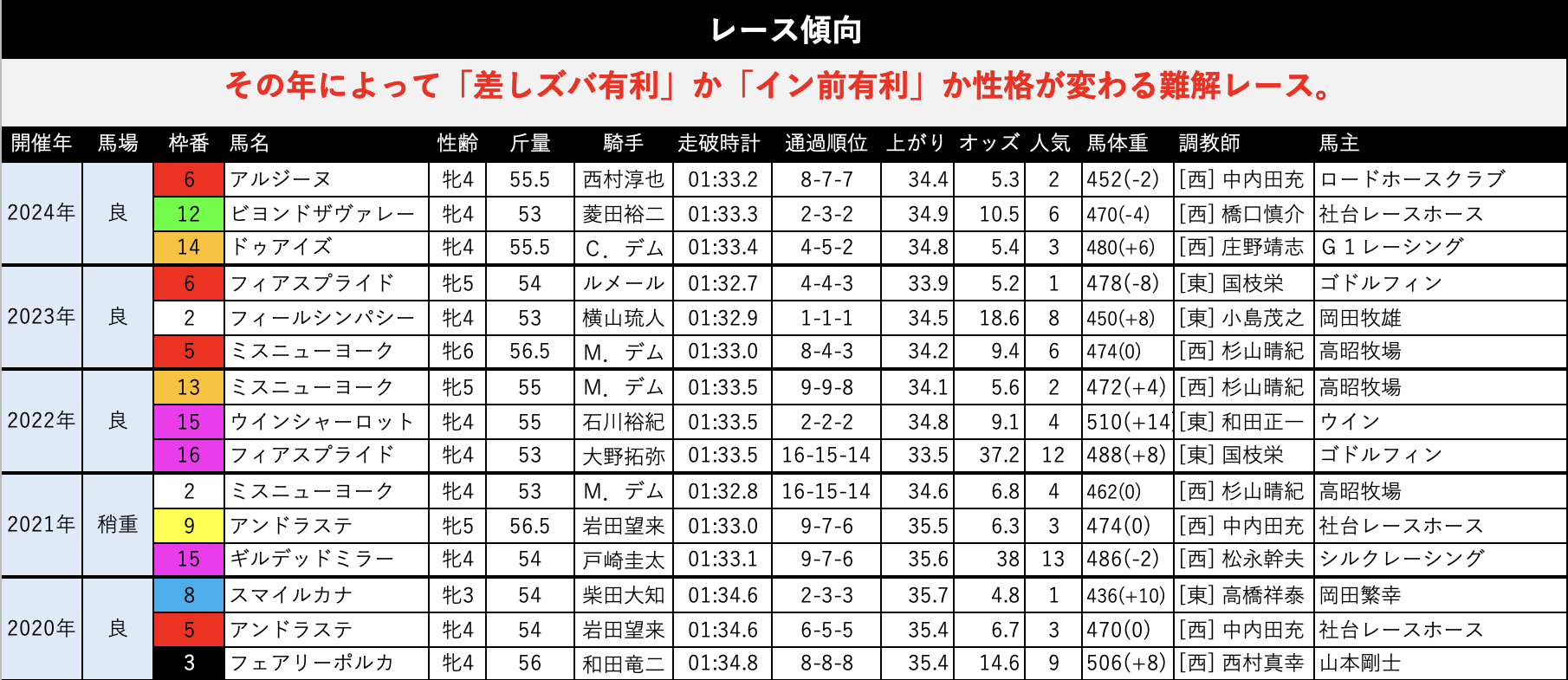 癖の強い舞台ということもあって、ミスニューヨークが3年連続で好走したことを筆頭にリピーターの活躍が目立つのも特徴です。