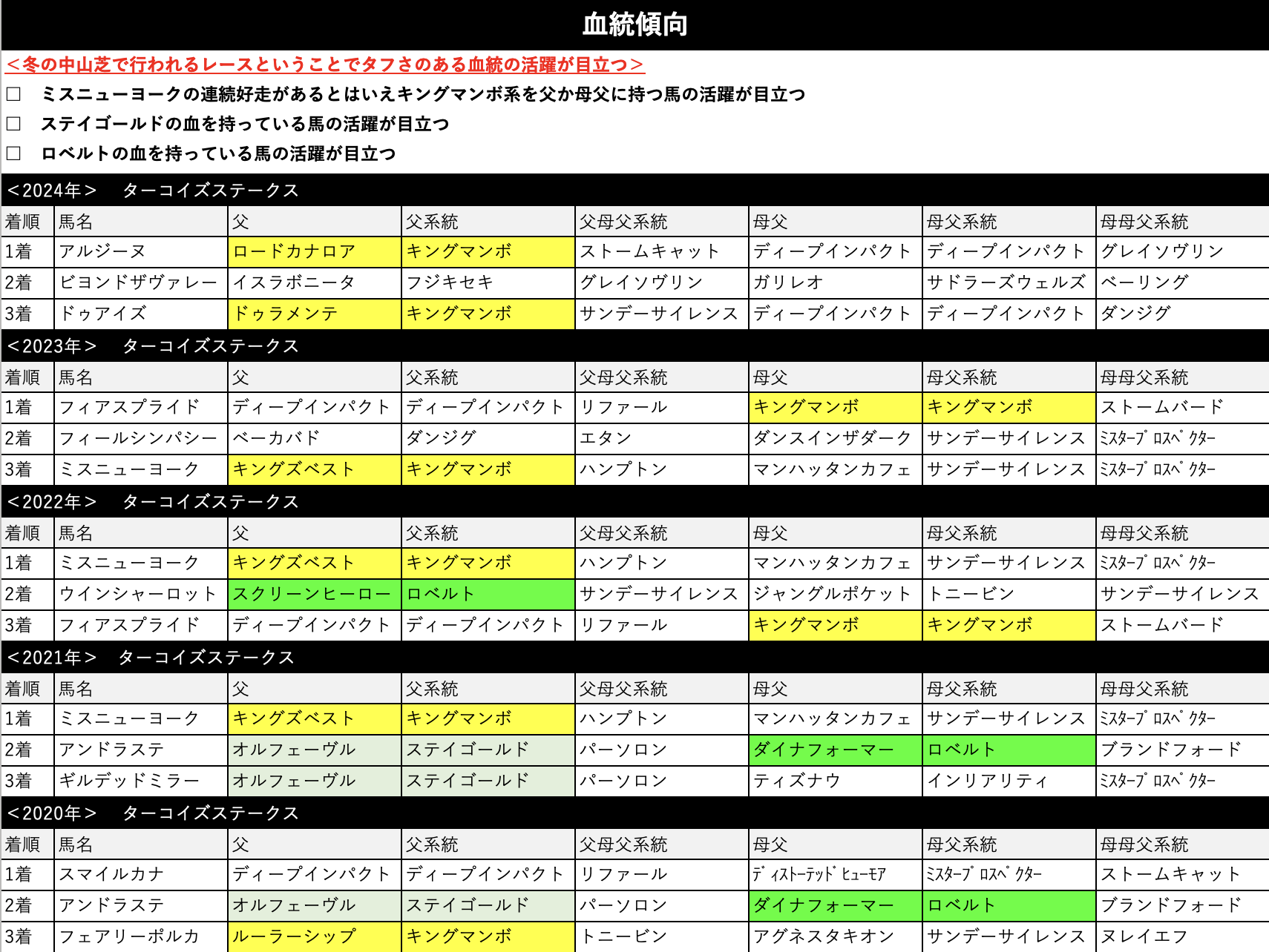冬の中山芝で行われるレースでタフさを補完する血統の成績が優秀。キングマンボ系やステイゴールド系やロベルト系を持つ馬は注目したいですね。