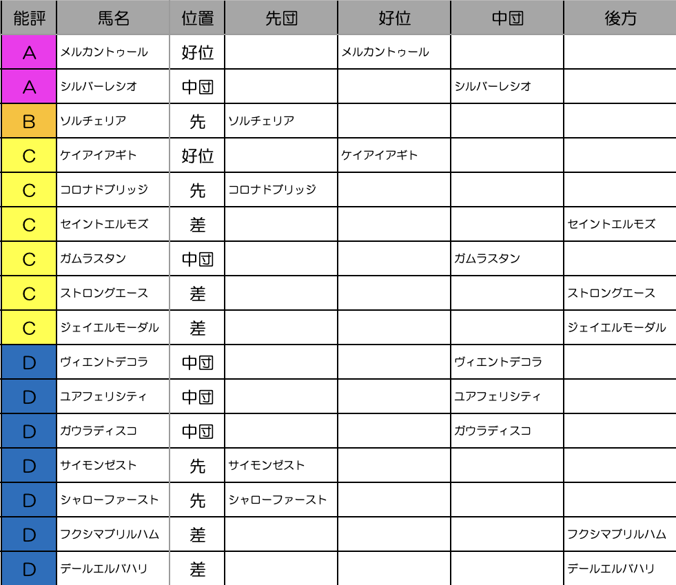 これを見れば縦比較で走破時計やレースラップがどれくらい優秀なのか把握できますし、予想の際にこれを見ればどの馬が強いレースを戦ってきたのかが一目瞭然です。