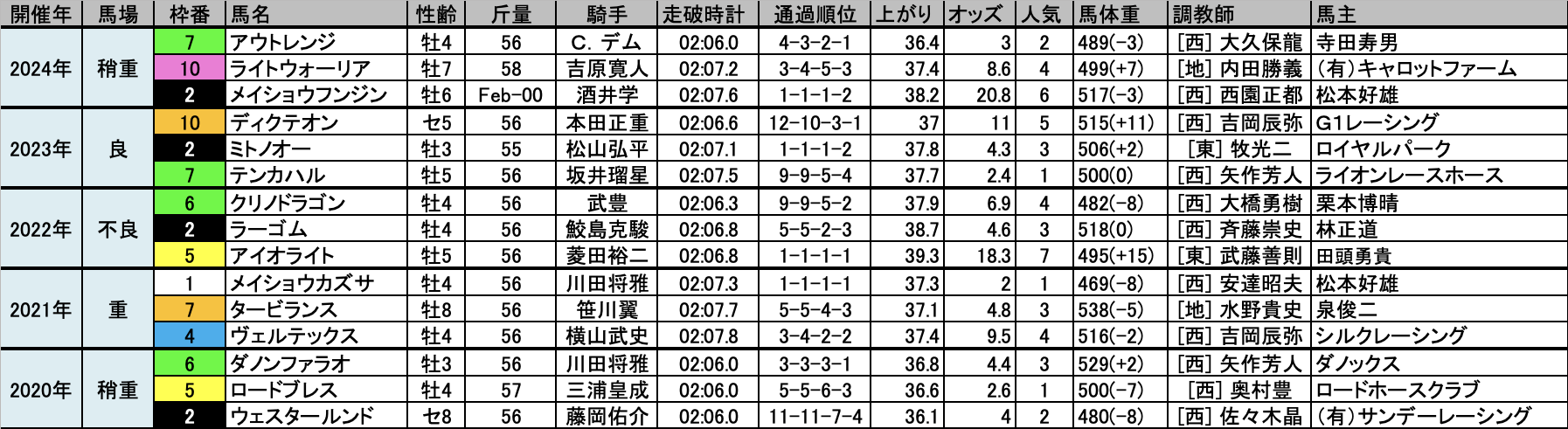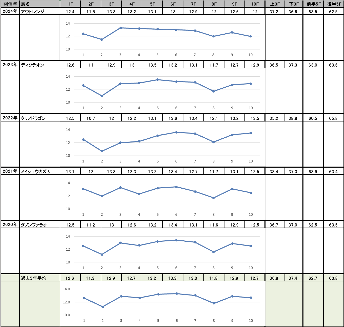 過去5年のレースラップはこんな感じ。8ハロン目の3コーナー地点のところがこのレースの全てと言って良さそうで、ここの急激なペースアップに耐えられるかどうかで好走できるかが決まってきます。