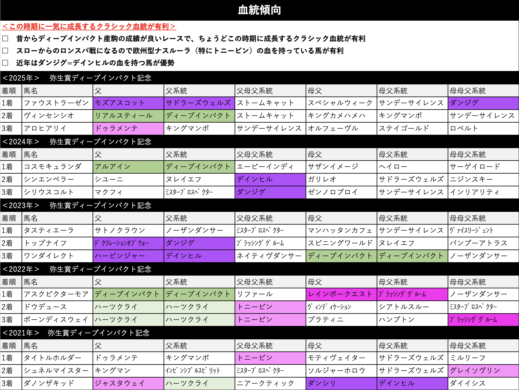 通算成績でディープインパクト産駒が勝率4割超え、複勝率も6割超えという圧巻の成績。もうクラシックもすぐの時期になるということで、この時期に一気に力をつけてクラシックを勝ち負けできるような王道血統が走りやすいレースです。