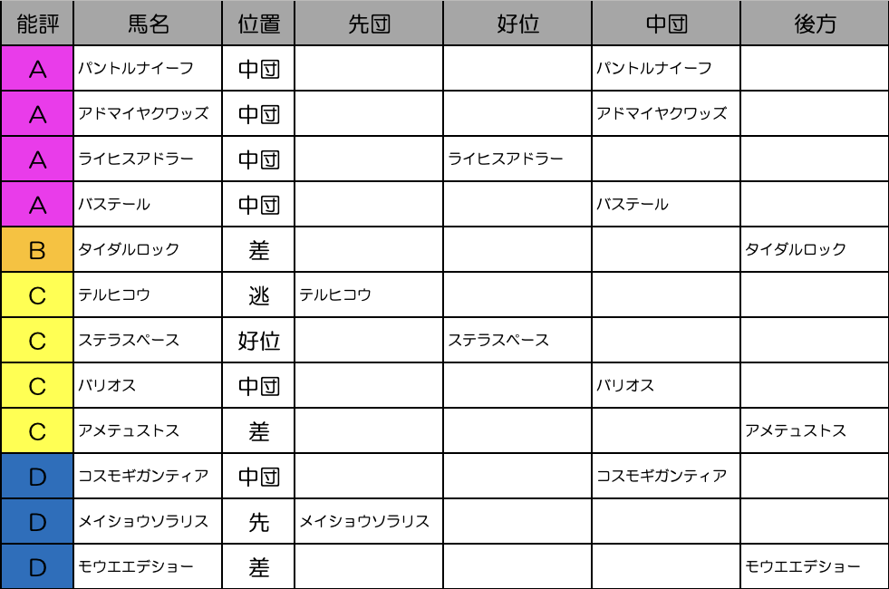 ステラスペースかメイショウソラリスの逃げが濃厚。馬場次第ではそれなりにペースが流れる可能性もありますが、まぁトライアル戦だけに流れが緩む方を考えておいた方が良さそうです。